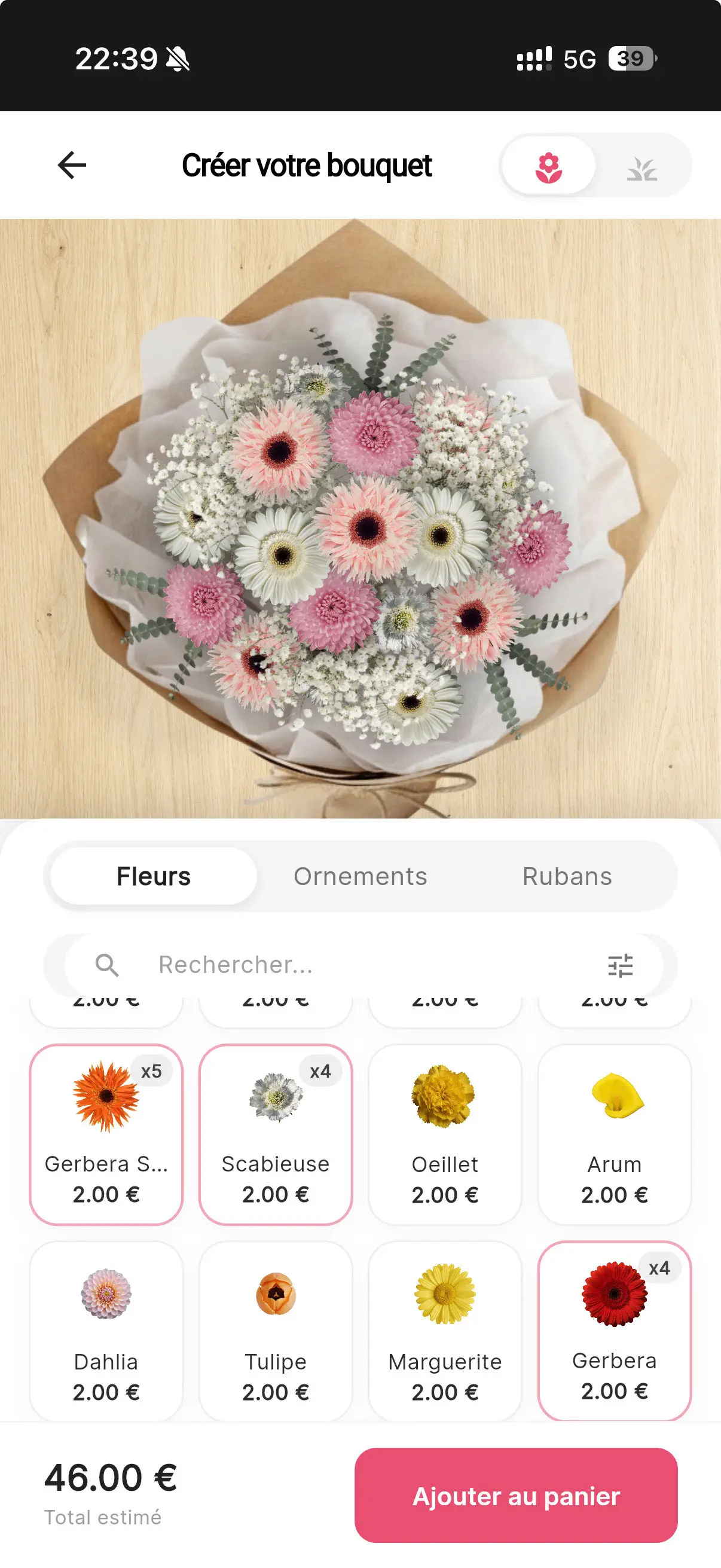 Sélectionnez vos fleurs préférées une par une depuis le stock réel de la boutique.